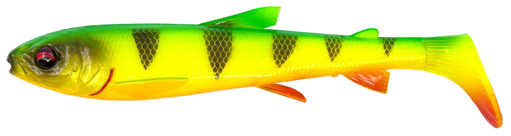 Egy valós fehérhal szkennelése alapján készült ez a laza testű pálcafarok műcsali, amely kifinomult részletekkel és fantasztikus gördülő és rúgó mozgással rendelkezik. A dundi fej és az első testrész sok vizet lövell, ezáltal nagy stabilitást biztosít a sekély szerelés során. Az ízületes és szuperrealisztikus uszonyok remek másodlagos mozgást adnak a nagy pálcafarok rúgásához, amelyben zajos üveg zörgő is található a plusz vonzerő érdekében. Szuperpuha PVC anyagból készült, lenyűgöző színekkel és csábító illattal.