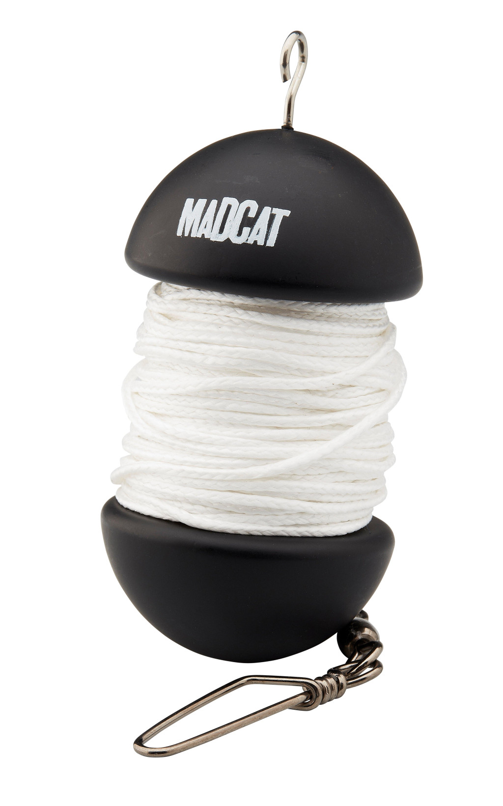 Horgonykötél harcsázóbójákhoz (15 méter). Vezesd át a kapcsott a bója szemén, rögzítsd a horgonykőhöz, és ejtse a követ a kívánt helyre. Az úszótestről automatikusan letekeredik a zsinór, amíg a horgony el nem éri a feneket. A zsinór rögzítéséhez vezesd át a zsinórt a nyíláson, és többször tekerd a kampó köré. A MADCAT bójakötél nagy előnye, hogy rendezetten tárolható.