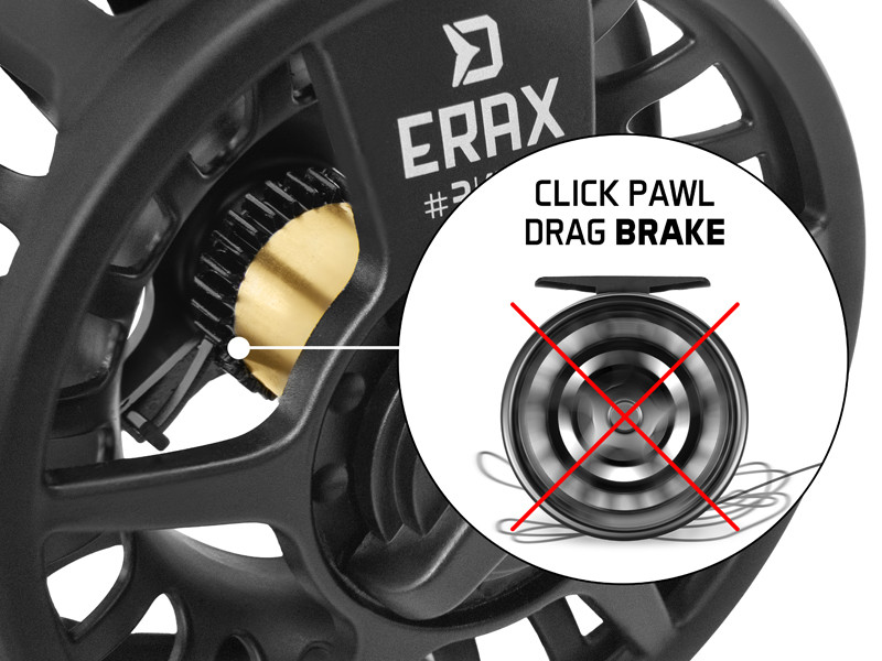 Az ERAX rendkívül érzékeny féke alaposan el van rejtve az orsóházban, hogy jobban ellenálljon a szennyeződéseknek és a homoknak, különösen akkor, ha horgászat közben víz éri. A fék zárópecek biztosítással rendelkezik, amely megakadályozza az orsó túlpörögését, amikor a hal hirtelen nagyon gyorsan mozog. Ezenkívül megakadályozza a zsinór összegabalyodását, ami a megakasztott hal elvesztéséhez vezethetne.