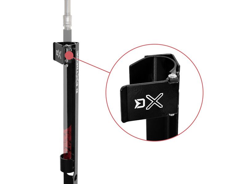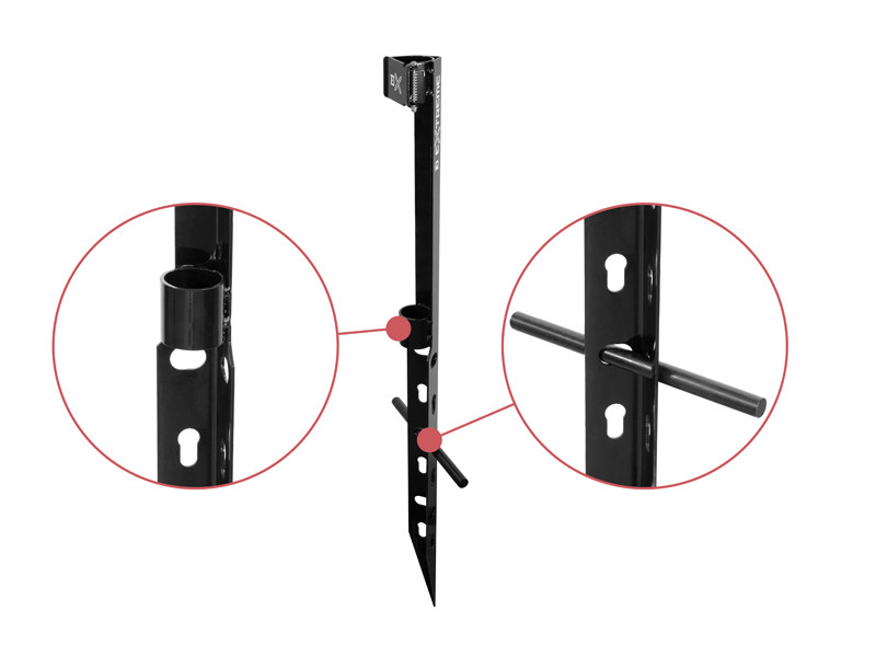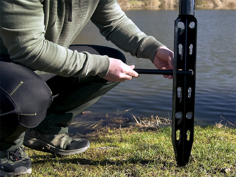 A felső részen található erős zárszerkezet biztonságosan a helyén tartja a harcsázó botot, megakadályozva annak kiesését egy erőteljes kapás során. A hegesztett bottartóval együtt ez garantálja, hogy a bot minden körülmények között stabilan a helyén maradjon. A víz felgyülemlésének megelőzése érdekében két vízelvezető kivágás található a tartó alján.