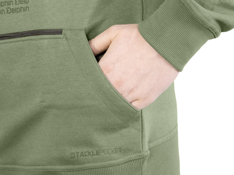 Nagyméretű kapucnival rendelkezik, széles húzózsinórral, amely szükség esetén állítható. Az ujjak végei keskenyek, és rugalmas mandzsettákkal vannak felszerelve, hogy szorosan illeszkedjenek a csukló köré. Ezenkívül a pulóver egy nagy, kétoldalas cipzárral ellátott TACKLE POCKET-tel rendelkezik, amely alkalmas horgászfelszerelések vagy olyan alapvető tárgyak tárolására, mint a telefon vagy a pénztárca. Alatta egy nagy kenguru zseb is található, amely tökéletes lehet kézmelegítésre a hideg időben. A derék része egy elasztikus pánttal is el van látva, hogy még jobban illeszkedjen a testhez.