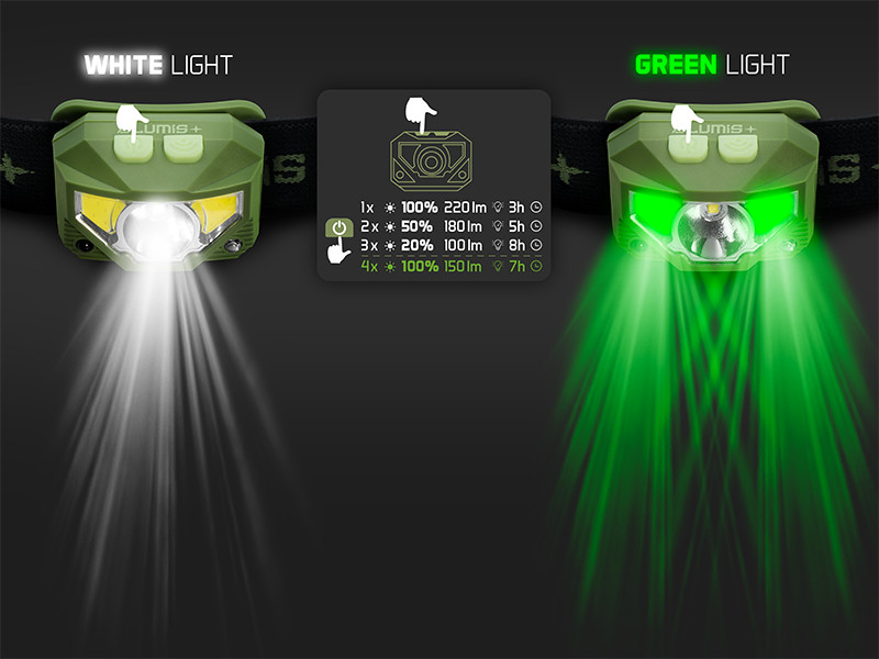 A fejlámpa két LED-del van felszerelve, így válthatunk a hagyományos fehér és a zöld fény között. A világítási módok a bekapcsológomb nyomogatásával válthatók. A fehér fény három különböző fényerőfokozatra állítható: