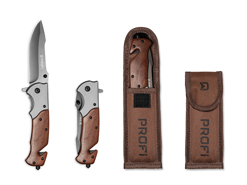 A kés nyele kiváló minőségű fa és fém kombinációjából készül. Csíptetővel rendelkezik, így könnyen rögzíthető övre, vagy akár a zsebében, nehogy kiessen. A penge teljes hossza 100 mm és rendelkezik egy használat közbeni összehajtás elleni védelmi mechanizmussal. A penge lándzsahegy alakú, felül hamis éllel. A PROFI kés tartalmaz még egy zsinórvágót, egy kötélvágót és egy éles hegyet üvegtöréshez.