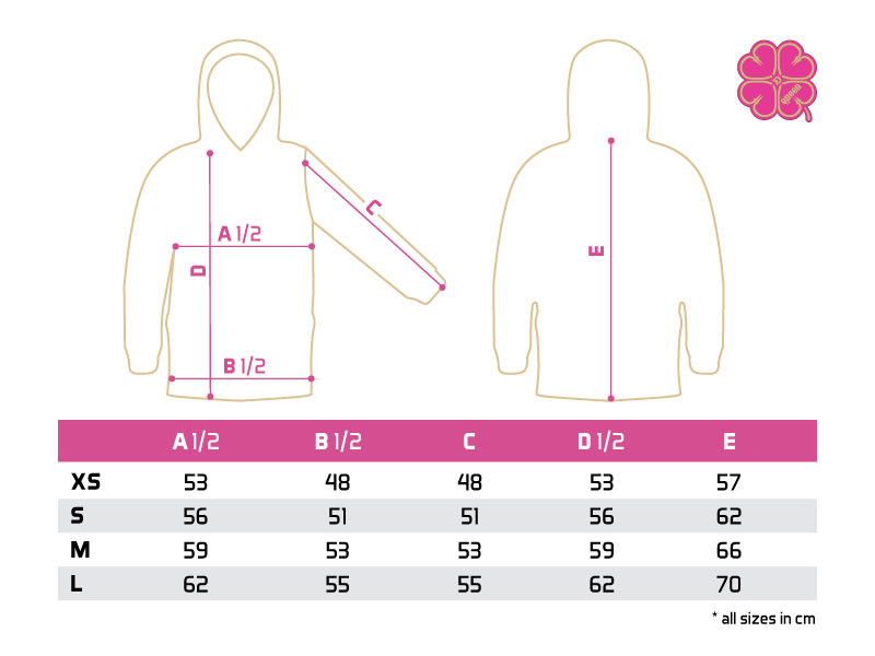 A pulóver elején egy nagy zárható zseb található, minőségi dupla cipzárral. Az oldalzsebek melegen fogják tartani kezeit a hidegebb időben. A kapucni kívülről rózsaszín, belülről fekete, Delphin logóval és sárga színű négylevelű lóherével díszítve. Ráadásul fekete húzózsinórral is rendelkezik. A kapucnis pulóver szorosan illeszkedő rugalmas derékkal és mandzsettával rendelkezik.