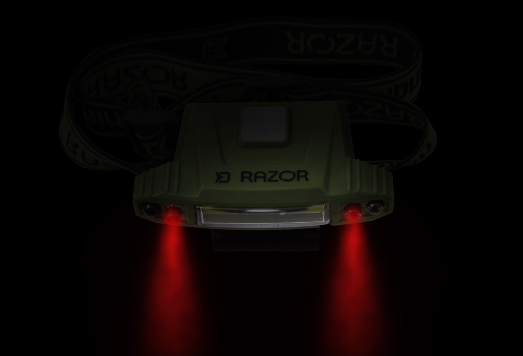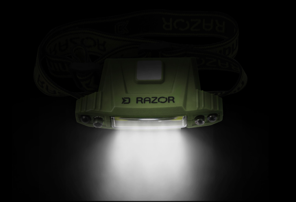 A Delphin RAZOR USB egy praktikus zöld színű LED fejlámpa beépített Li-on elemmel, melynek kapacitása 500mAh. A hagyományos módon való viseleten kívül a könnyű súlyának köszönhetően és a beépített szerkezetnek köszönhetően felfogatható a siltre. Mozgásérzékelővel is el van látva, egyszerű a kezelése, memória funkciójának köszönhetően megjegyzi a világítás intenzitását és a világítás színét. A fényerőnek három mértéke van. Az első gombnyomásnál 30% a fényerő melynél 8 óra az elem kapacitása, a második gombnyomás után 100% a fényerő és ez 3 óra világítást biztosít, a harmadik gombnyomás után 100% fényerő piros fény 3 óra világítást biztosít. Maximális fényerőnél a teljesítmény 85lm. USB-C kábelen keresztül könnyen tölthető közvetlenül egy powerbank segítségével, és a töltés körülbelül 2 órát vesz igénybe.