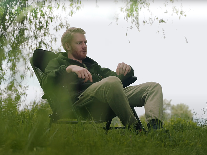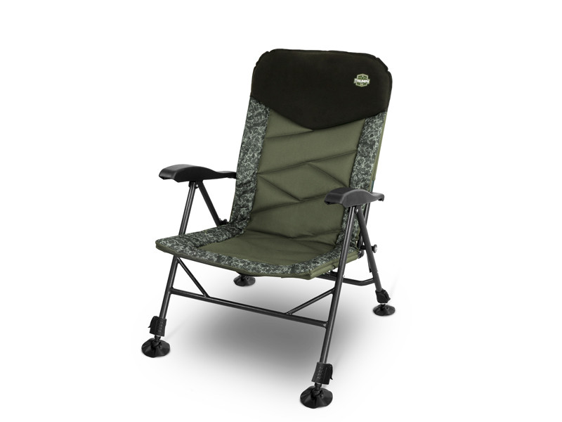 A szék karjaiban elhelyezett állítható mechanizmus lehetővé teszi a háttámla dőlésszögének változtatását a horgász igényei szerint. A fej és a nyak maximális kényelmét a sötétzöld színű extrán párnázott polár fejtámla biztosítja, amelyen a termék logója látható. A háttámlában és az ülőrészben található matrac tartós 600D anyagból készült, egyedi átlós varrással. A széleit 600D szövet borítja, szabadalmaztatott C2G terepszínben. A halfogások közötti kellemes időtöltés érdekében a szék ergonomikusan kialakított karfákkal van felszerelve, amelyek tökéletes kényelmet nyújtanak pihenés és a természetben való gyönyörködés közben.
