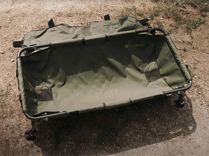 A TeleSAFE+ pontybölcső alapját 22mm átmérőjű acél szerkezet alkotja. Ennek köszönhetően nagyon jó a stabilitása, nem dől fel, nem sérül a fogással való manipulálásnál. A használt gumírozott anyagnak több előnye van. Horgászat végén elég kitörülni és nem kell várni, hogy megszáradjon. Ráadásul könnyen mosható és nem szívja magába a kellemetlen szagokat, melyek szállításkor az autójában terjengenek. A pontybölcső nagyon erős és az extrém tesztek során sikerült megtartania 75kg statikus súlyt. Mindkét végén hálós anyag van belevarrva, merre a víz ki tud futni. A TeleSAFE+ rendelkezik takaró anyaggal, melyen tépőzár van. Ennek köszönhetően a fogását le tudja takarni míg előkészíti fényképezőgépét, vagy vízzé megyen, hogy le tudja locsolni. A teleszkópos lábak csuklós tappancsokkal vannak ellátva, így jól illeszkednek a terephez, nem süppednek bele ha puhább a talaj. A tervezésnél gondoltunk a szállításra is, mely szintén erős része ennek a terméknek. A közepén a szerkezet el van felezve, így elég ketté hajtania és a fogantyú segítségével könnyedén hordani.