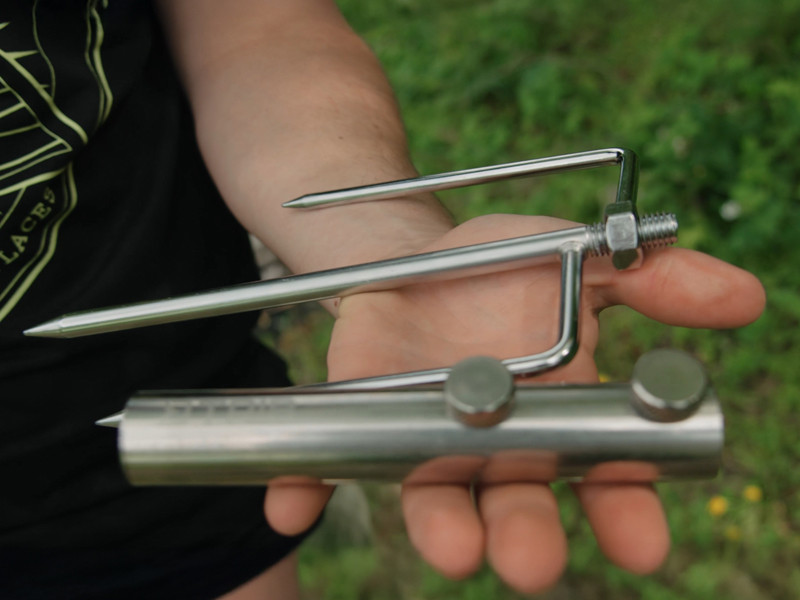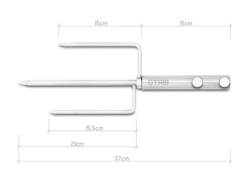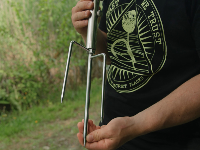 A három leszúrótüske tökéletes stabilitást nyújt, kialakításuknak köszönhetően pedig lábbal könnyen lenyomható, így kemény talajba is egyszerűen leszúrható. A hegyek krómozott felületkezelést kaptak, ami növeli az ellenállásukat a kopással és a korrózióval szemben. Az egyik tüske rögzítőanyával van ellátva, amely lehetővé teszi a megfelelő pozíció beállítását vagy annak teljes eltávolítását. A tüskék száma és elhelyezkedése testre szabható a talajhoz való leghatékonyabb rögzítés érdekében.