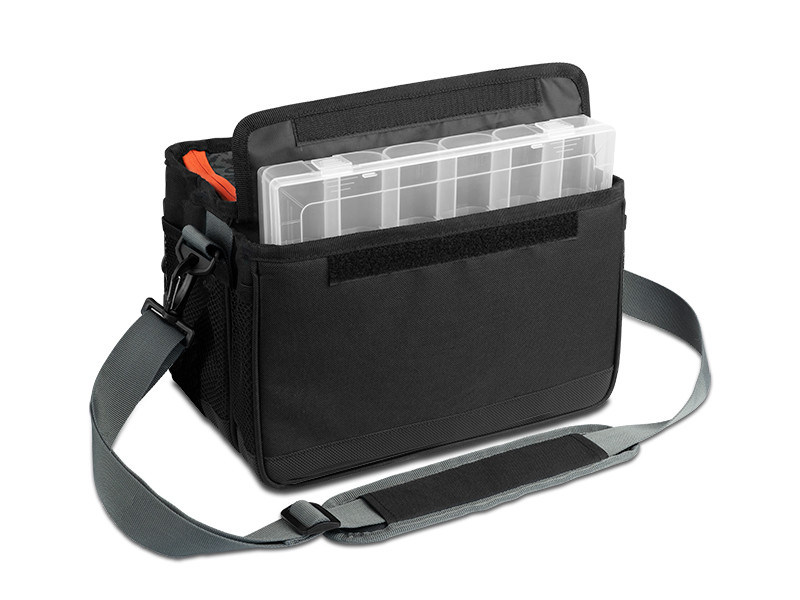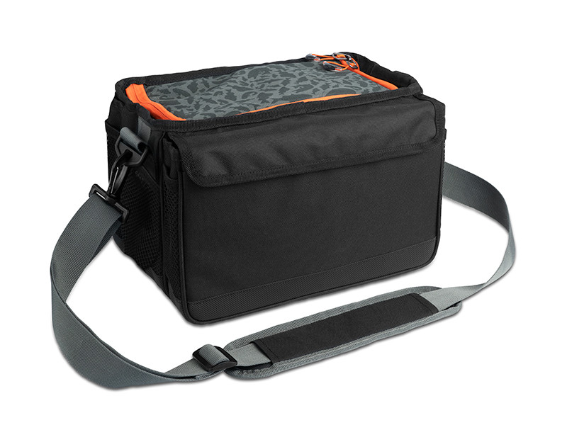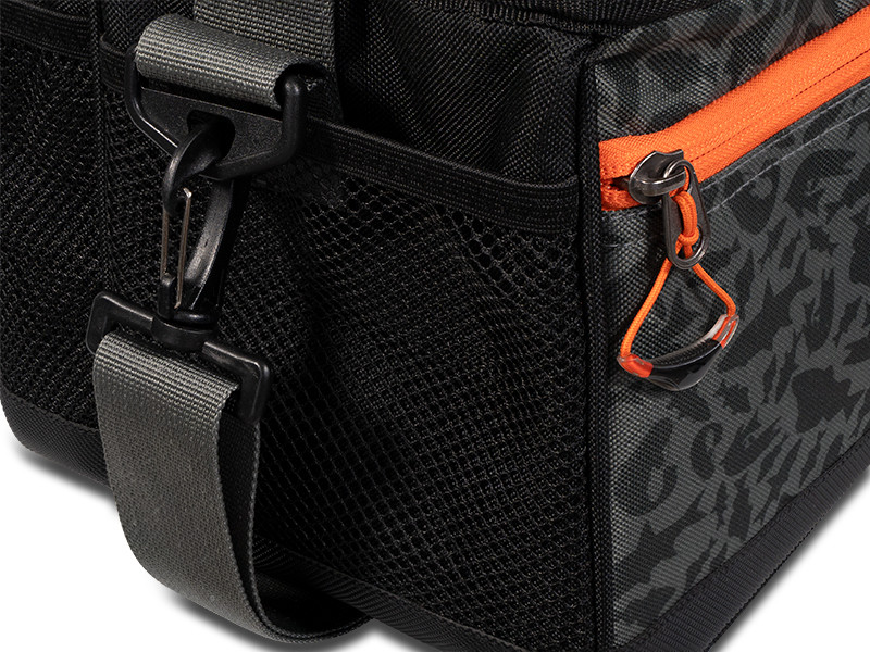Ezt a crossbody táskát a mellkasára helyezheti, hogy könnyen hozzáférjen a csalikhoz és a tartozékokhoz anélkül, hogy folyamatosan le kellene vennie a válláról. Így több időt és energiát takaríthat meg a horgászathoz. Egy tépőzárral gyorsan elérhető a táska fő rekesze, amiben egy műanyag tárolódoboz található kivehető elválasztókkal a csalik számára. Egy kisebb cipzáras zsebben egy EVA hab tároló is található, ami bevágásokkal rendelkezik a használatra kész csalik tárolására. Tépőzárral van rögzítve, ami azt jelenti, hogy levehető vagy kicserélhető. A zseb elég szélesre nyitható a kényelmes használathoz, és annak mindkét oldalán a varrott anyag megakadályozza, hogy a csalik kiessenek, ha esetleg nincsenek megfelelően rögzítve. Belül két kisebb hálós zseb és egy kis cipzáras zseb található az apró kiegészítők számára. A táska alsó részén egy mágnes található, amely minden tárgyat a helyén tart. A táska tetején található legkisebb cipzáras zsebben elfér a fogó és a csipesz.